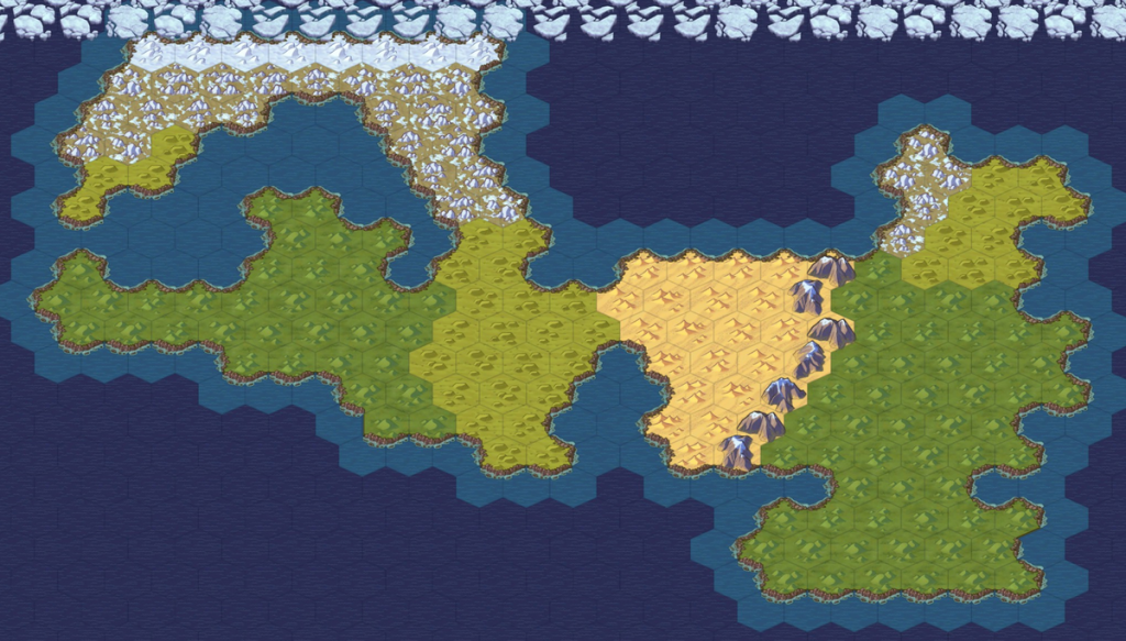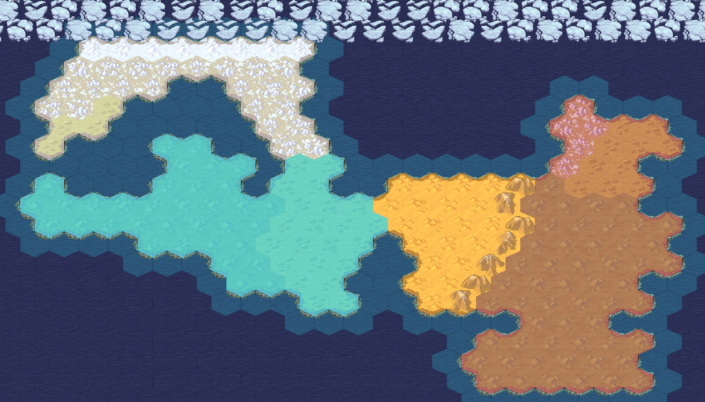 파란색이 갑자어, 하얀색이 을축어, 노란색이 병인어, 붉은색이 정묘어를 쓰는 지역이랍니다. 지형을 그린 이유는 특별한 건 아니고 이해를 돕기 위해 그려봤습니다.